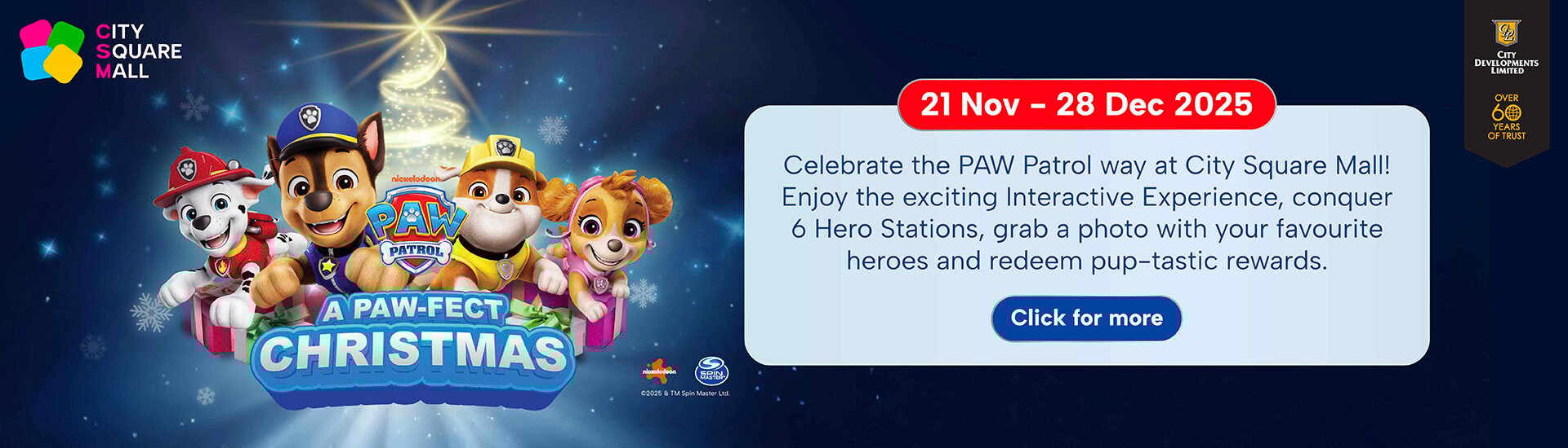 Celebrate the PAW Patrol way at City Square Mall! Enjoy the exciting Interactive Experience, conquer 6 Hero Stations, grab a photo with your favourite heroes and redeem pup-tastic rewards. Click here for campaign's terms and conditions.
