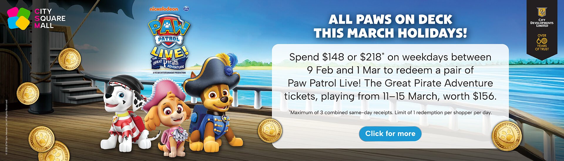 Celebrate a PAW-sperous Chinese New Year with PAW Patrol® at City Square Mall to Usher in the Year of the Horse! Click here for Blooming Crafts workshop schedule. Click here for campaign's terms and conditions.