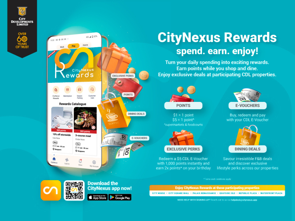Get rewarded while you shop at CDL malls! With CityNexus Rewards, you can shop, earn, and redeem seamlessly at participating retailers. Simply scan and submit your receipts through the app to accumulate points and unlock exciting rewards!