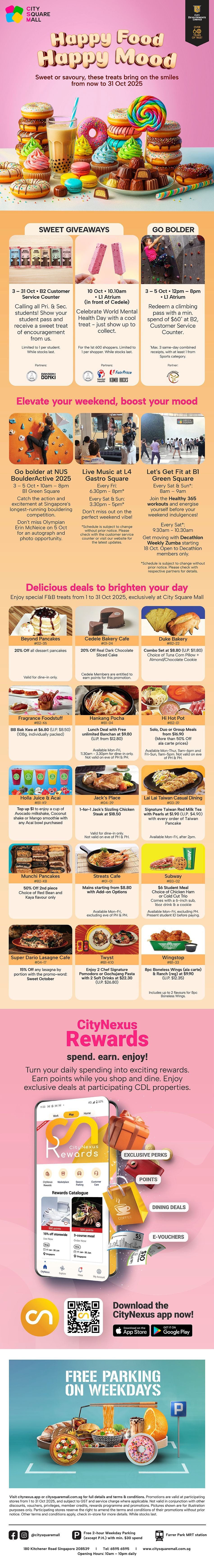 From 3 to 31 October, students can redeem free sweet treats of encouragement from us! Shoppers can also indulge in a complimentary ice cream on 10 October at 10.10am in commemoration of World Mental Health Day, along with feel-good F&B deals happening until 31 October.